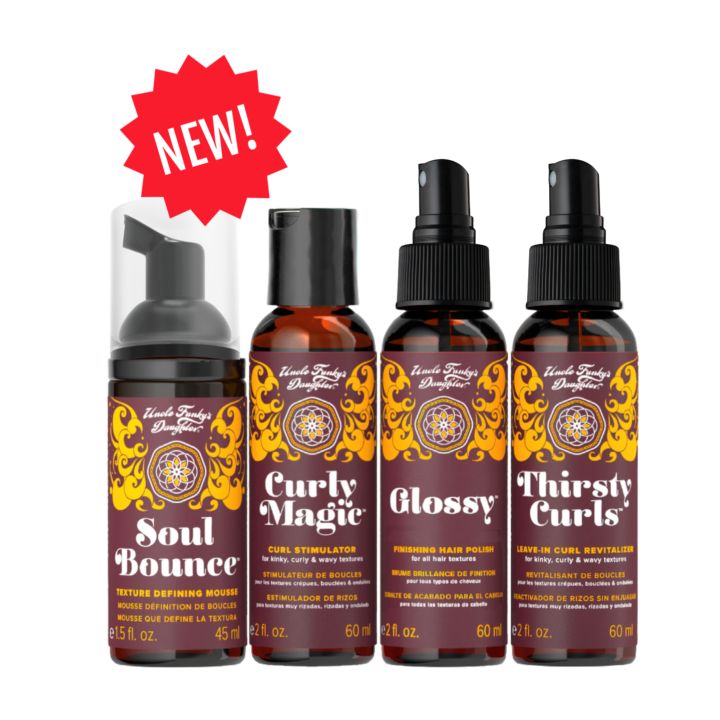 Travel smooth with our TSA-approved kit, featuring mini versions of our best-selling stylers. Perfect for trying our coolest picks on the fly! (4) Net weight (1.5 - 2 oz) size bottles.